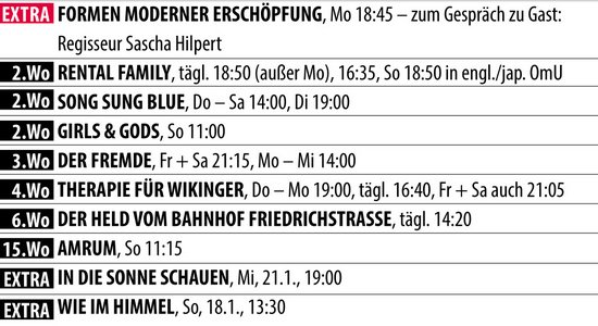 Do – Mo 19:00, tägl. 16:40, Fr + Sa auch 21:05