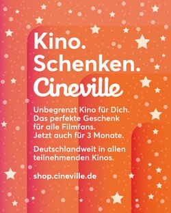 Cineville ist das bundesweite Kino-Abo für alle, die gutes Kino lieben und Lust auf Entdeckungen haben. Schon ab 20€ im Monat können Sie Teil der Cineville-Community werden. Mit der Cineville-Karte haben Sie unbegrenzten Zugang zum gesamten Filmprogramm von Deutschlands engagiertesten Kinos, zu Neustarts, Filmreihen, Festivals und Events.